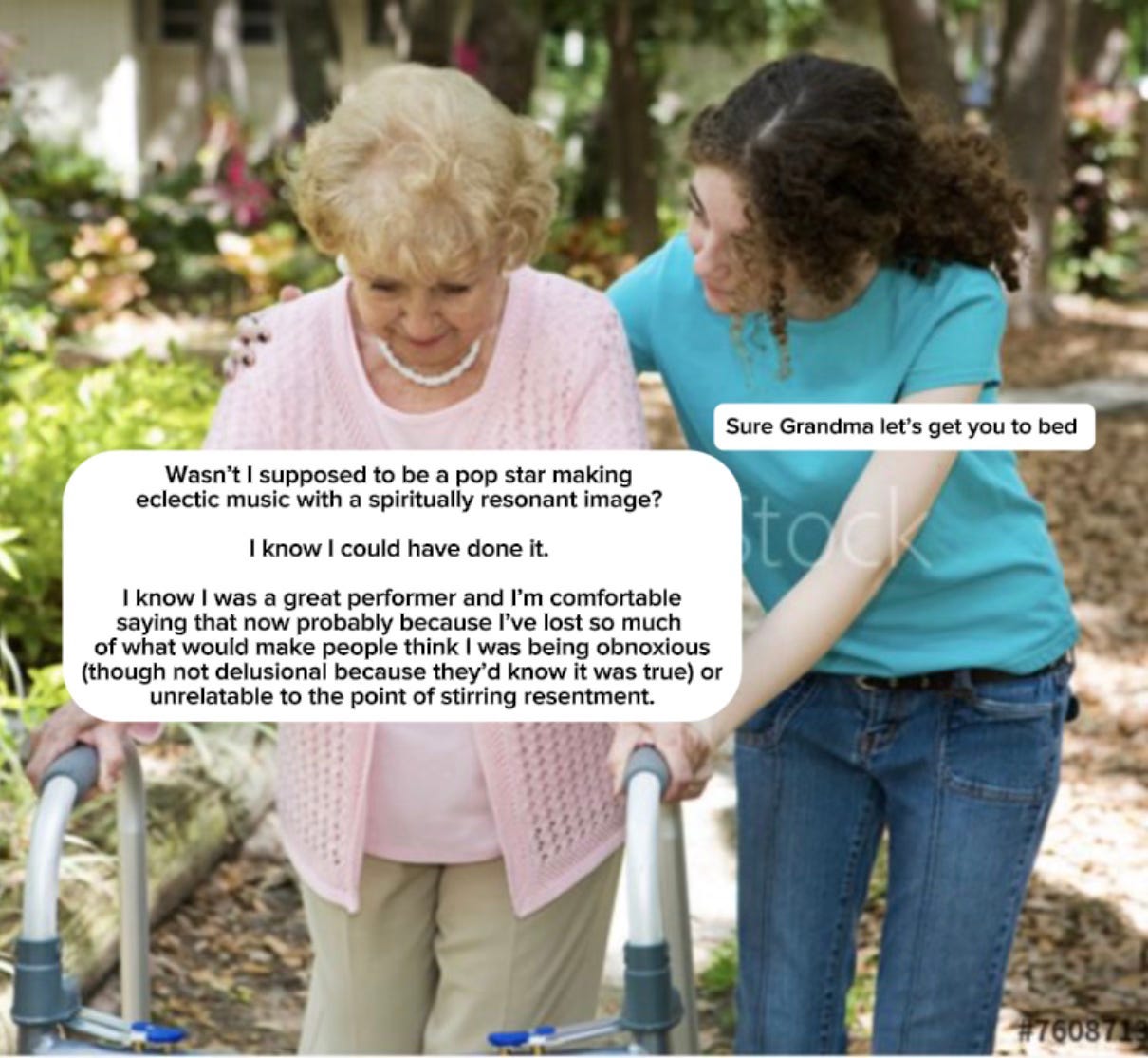 I know I could have done it. I know I was a great performer and I’m comfortable saying that now probably because I’ve lost so much of what would make people think I was being obnoxious by saying it (although not delusional because they would’ve known it was true) or unrelatable to the point of stirring resentment. It reminds me of that grandma meme now